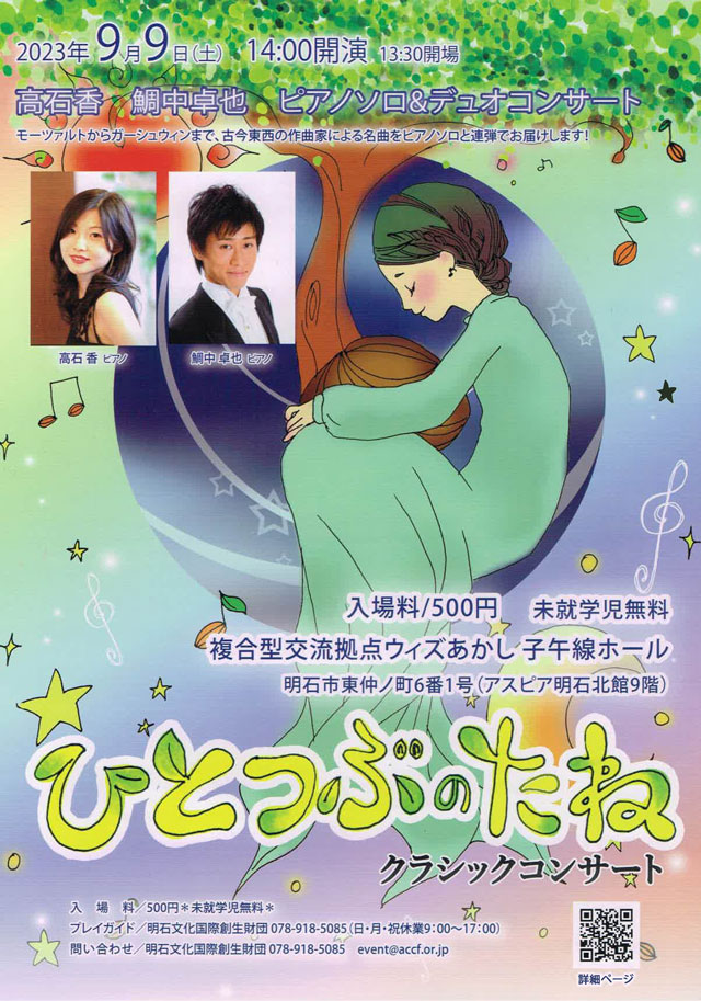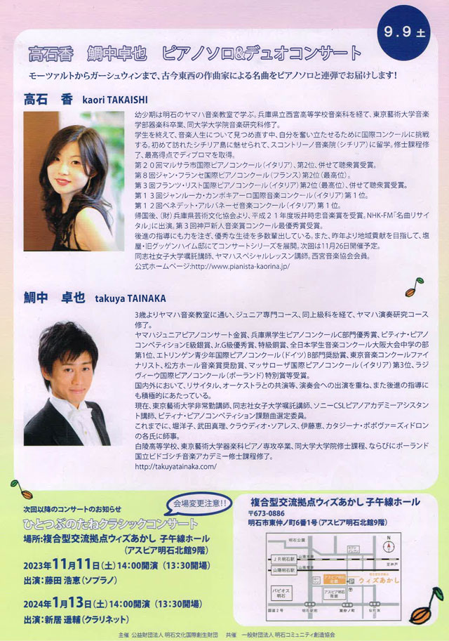 高石香 鯛中卓也 ピアノソロ&デュオコンサート ※終了しました。開催日時2023年9月9日(土)