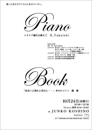 ピアニスト高石 香 | Kaori Takaishi,pianist- 帰ってきたピアニストと本のパーティー※終了しました。開催日時2008年10月24日会場at JUNKO KOSHINO Gallery 「G7」ピアニスト高石 香 | Kaori Takaishi,pianist