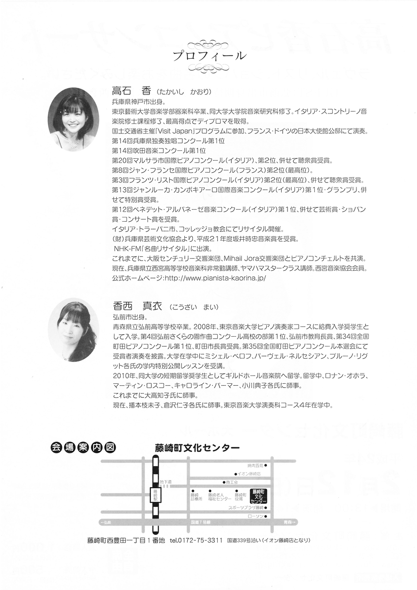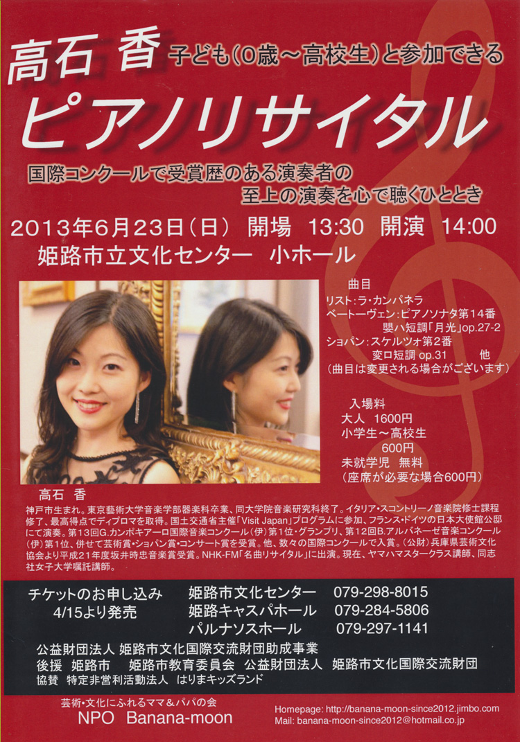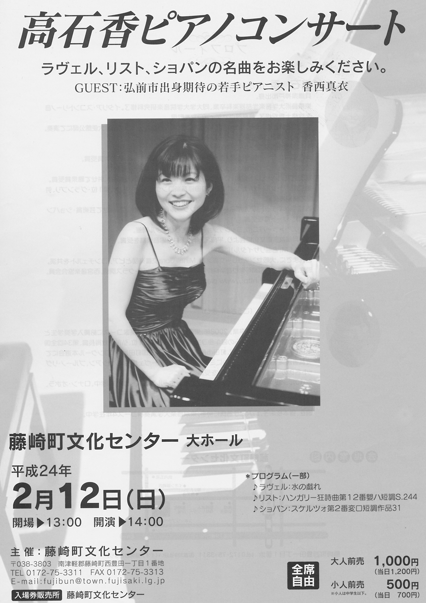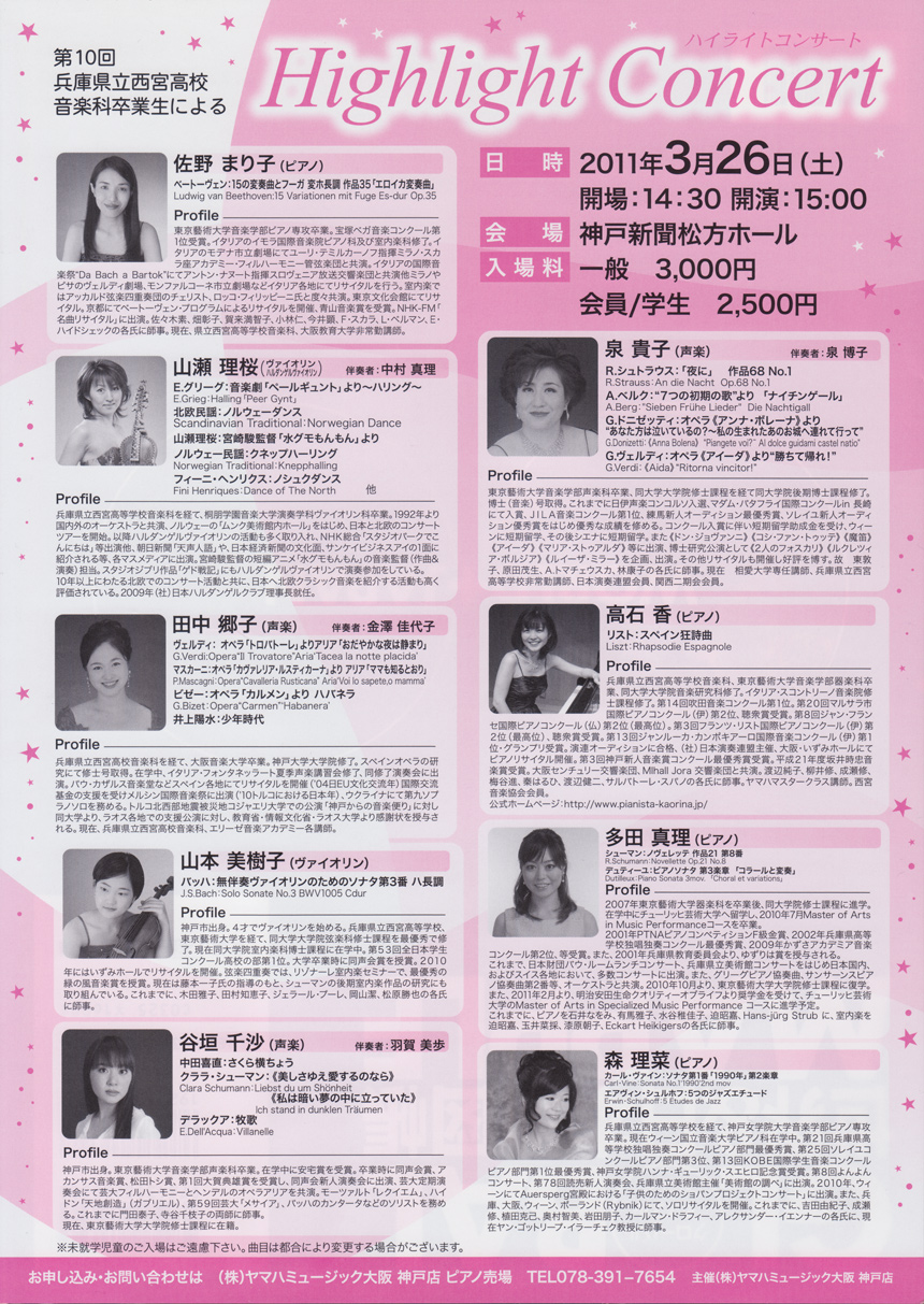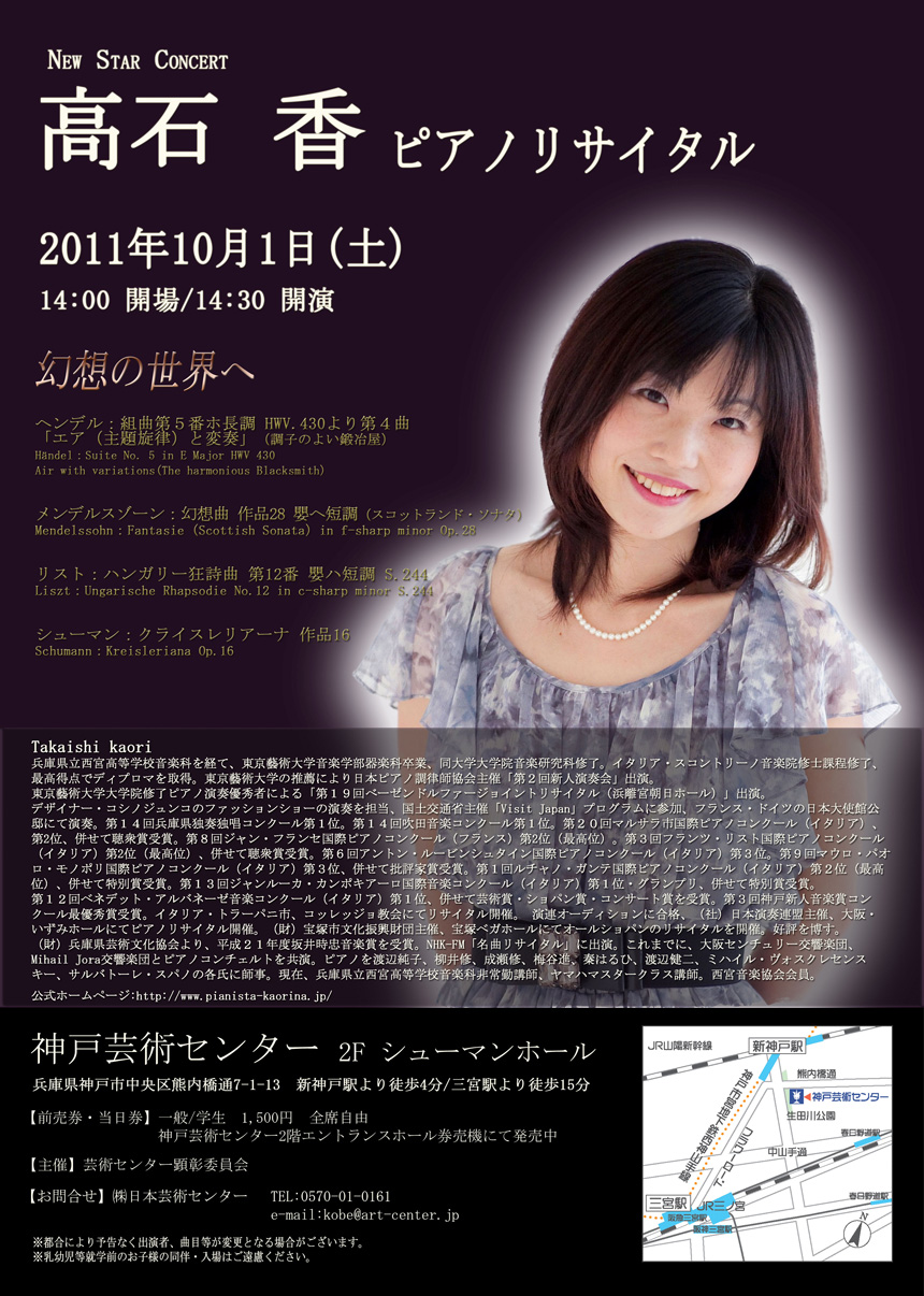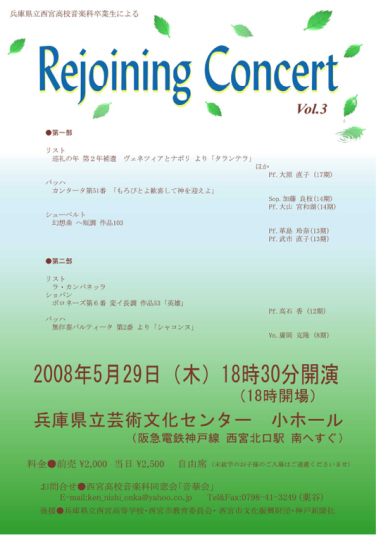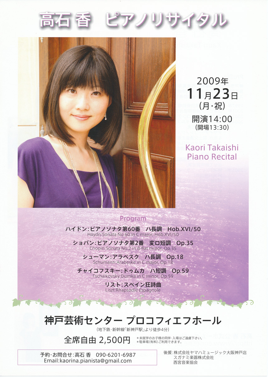 ピアニスト高石 香 | Kaori Takaishi,pianist- 兵庫県立西宮高校音楽家卒業生による「Rejoining Concert」(第二部に出演)※終了しました。開催日時2008年5月29日(木)18:30開演(18:00会場)会場兵庫県立芸術文化センター小ホールピアニスト高石 香 | Kaori Takaishi,pianist