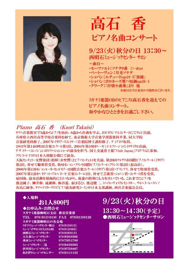 ピアニスト高石 香 | Kaori Takaishi,pianist- 高石香 ピアノ名曲コンサート※終了しました。開催日時2008年9月23日(火)秋分の日 13:30開演会場西明石ミュージックセンター サロンピアニスト高石 香 | Kaori Takaishi,pianist