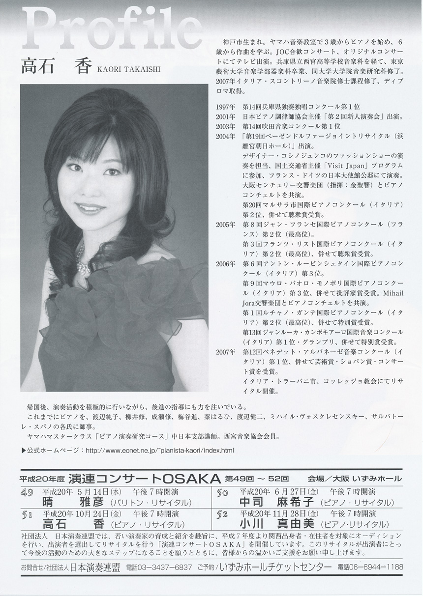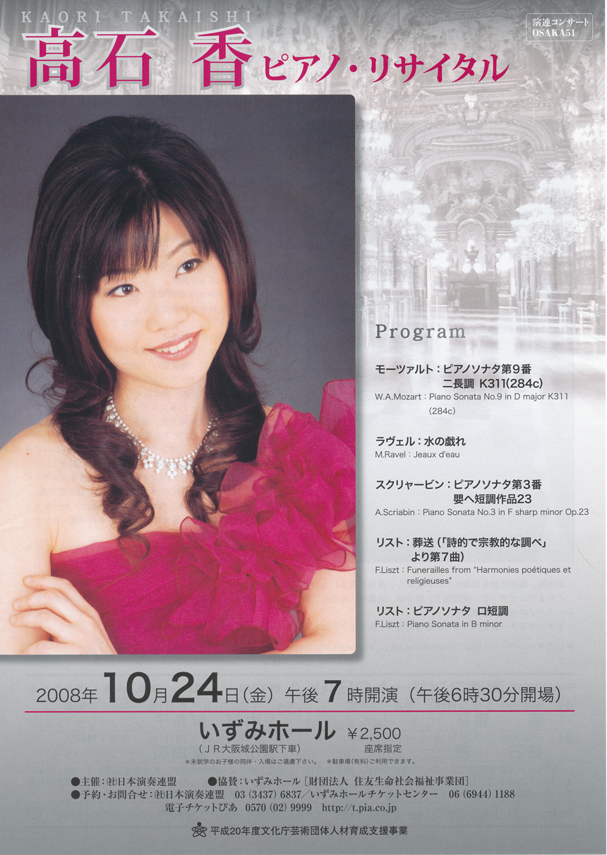 ピアニスト高石 香 | Kaori Takaishi,pianist- 高石 香 ピアノ・リサイタル※終了しました。開催日時2008年10月24日(金) 19:00時開演(18:30開場)会場大阪・いずみホール(JR大阪城公園駅下車)ピアニスト高石 香 | Kaori Takaishi,pianist