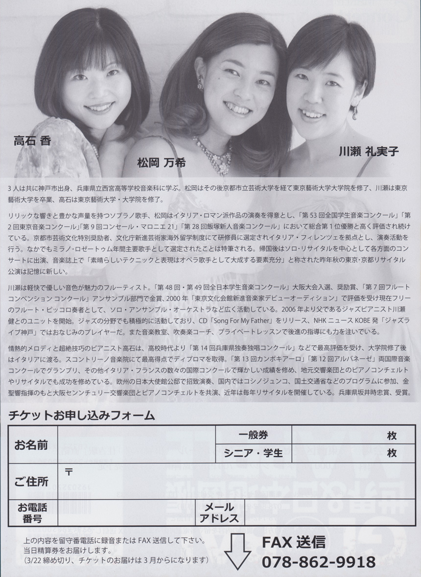 入場料3,500円(全席自由)お問合せ・チケット取り扱い◆オフィスフェリーチェ: