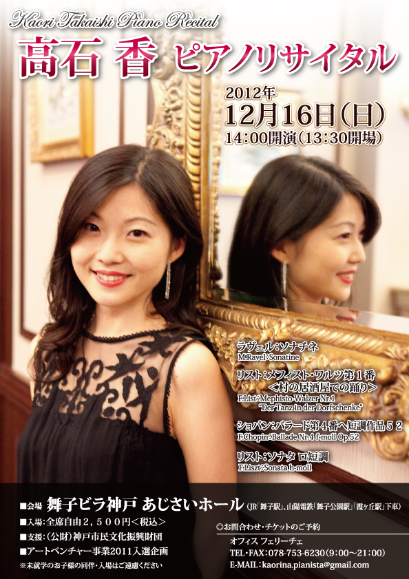 ピアニスト高石 香 | Kaori Takaishi,pianist- 高石 香 ピアノリサイタル~帰国記念演奏会~※終了しました。開催日時2007年 10月12日(金)18:30(18:00開場)会場舞子ビラ神戸【あじさいホール】ピアニスト高石 香 | Kaori Takaishi,pianist